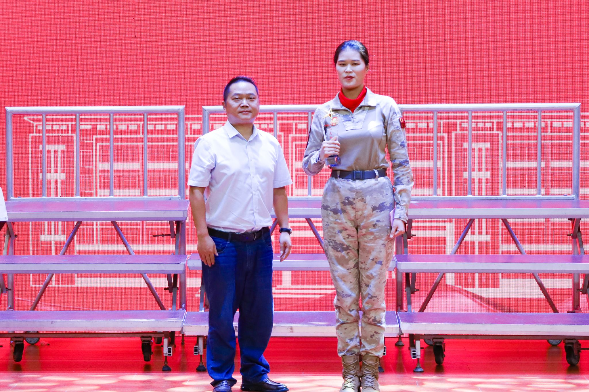 外国语学院党委书记徐华胜为老生代表93阅兵参与者、商务英语2023级1班谭宁颁发“外国语学院励志担当楷模”荣誉称号,以此表彰其优秀表现,并激励全体学生见贤思齐。谭宁用“坚持”“团结”“担当”三个关键词分享了她五年的军旅生涯和50余场国家级仪仗司礼任务,鼓励同学们将对祖国的热爱,化作日常学习生活中的不懈动力。
