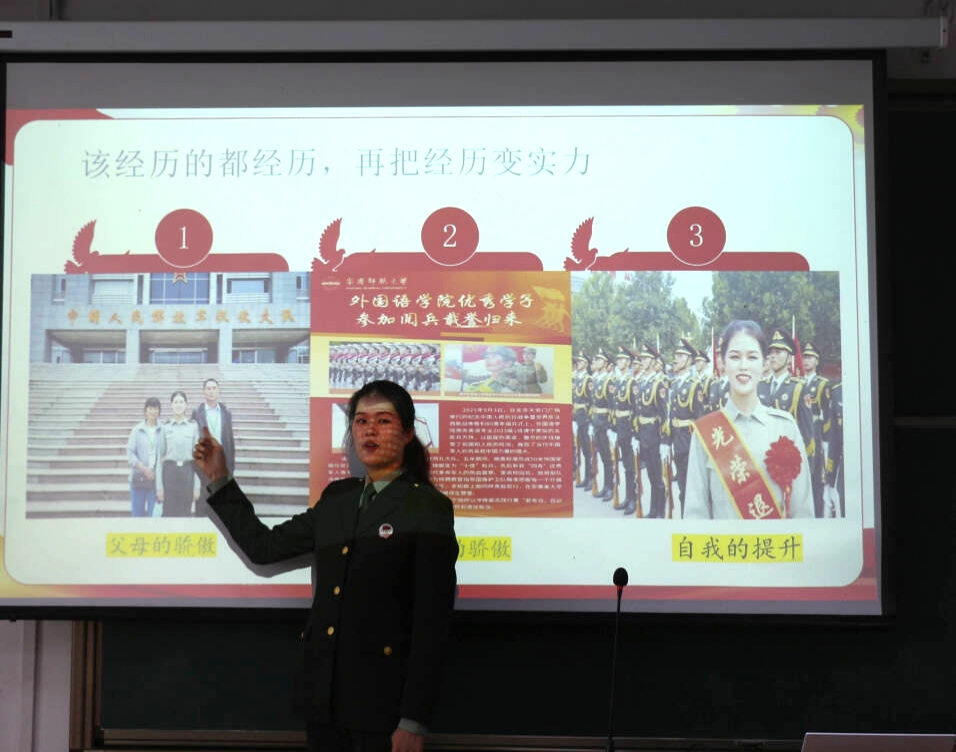 外国语学院退役大学生谭宁则结合自身五年的服役经历,以及参加纪念中国人民抗日战争暨世界反法西斯战争胜利80周年阅兵仪式的收获和感悟,生动诠释了“强国复兴有我,青春献给祖国”的豪情壮志。她鼓励同学们积极投身军营磨砺个人品质,体验青春与国家发展共同跳动的美好,进一步增强了国防教育的感染力和号召力。