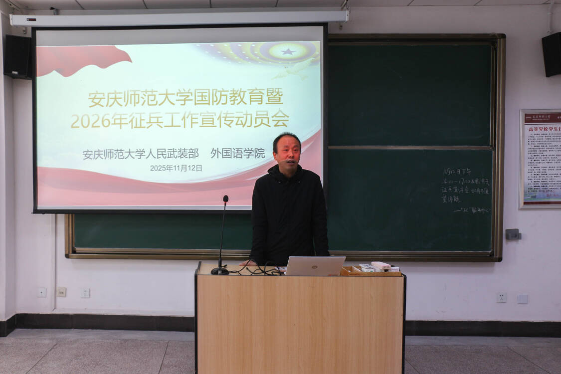 11月12日,安庆师范大学国防教育暨2026年征兵工作宣传动员会在外语楼320教室顺利举办。本次会议由校人民武装部与外国语学院联合举办,校人民武装部王友兵老师、外国语学院退役大学生谭宁应邀出席,外国语学院近百名同学参加了此次会议。