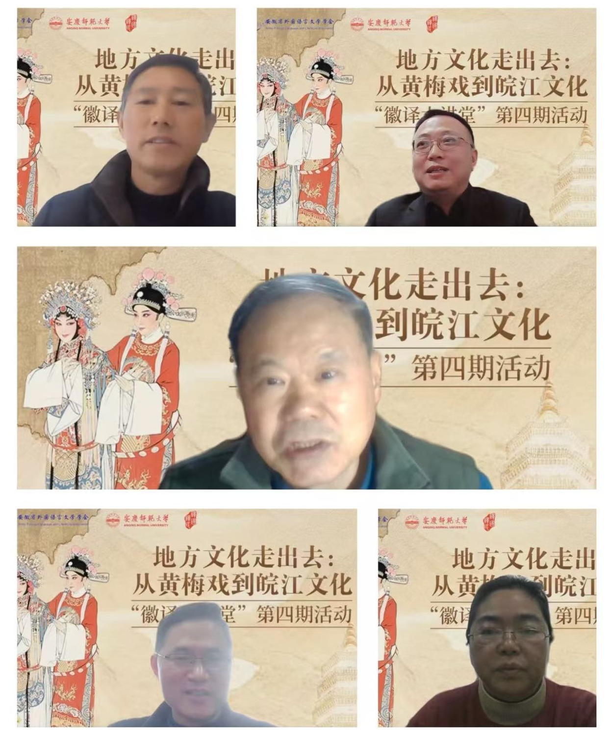 12月31日下午,由安徽省外国语言文学学会翻译教学研究分会主办,外国语学院、黄梅戏文化翻译与国际传播研究中心联合承办的“徽译大讲堂”第四期活动成功举办。本期活动以“地方文化走出去:从黄梅戏到皖江文化”为主题,邀请陈水生博士、王巧英副教授作专题报告。安徽省外国语言文学学会秘书长曹军教授、翻译教学研究分会主任张德让教授等专家学者出席活动,来自省内外20余所高校的近百名师生通过线上方式参加研讨。活动由外国语学院副院长黄全灿主持。