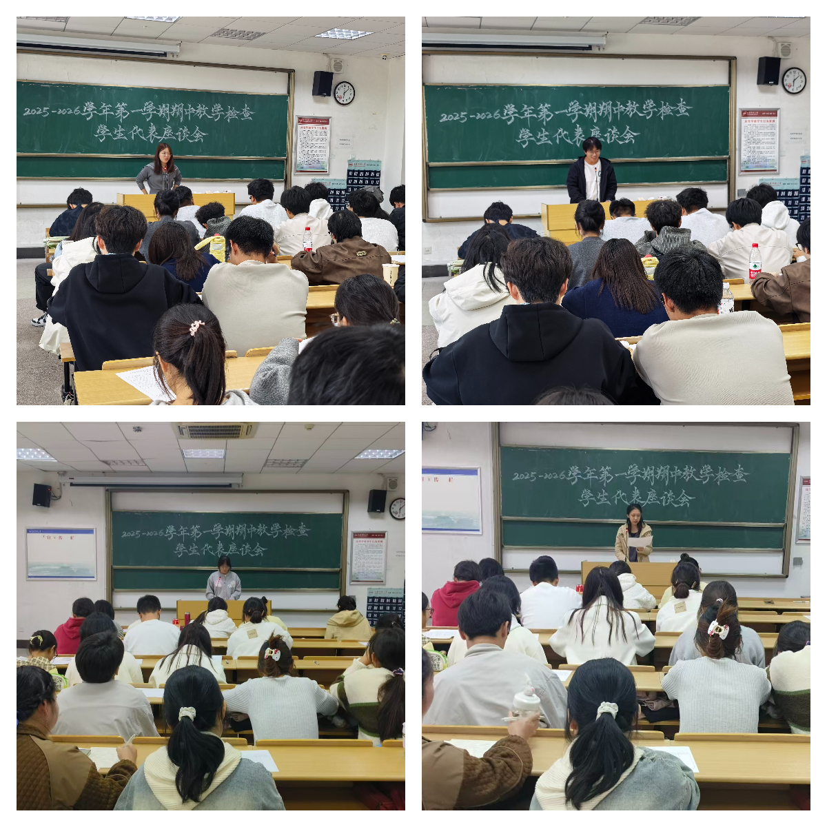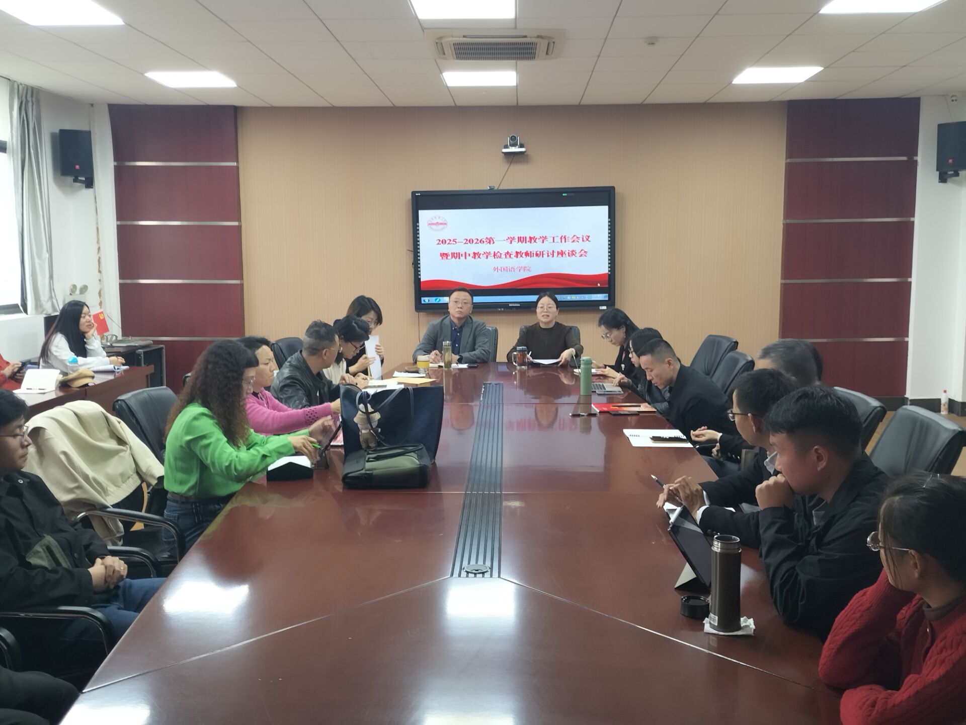 11月5日下午,外国语学院在E304会议室和E314教室同步举行2025-2026学年第一学期期中教学检查教师研讨座谈会与学生评教座谈会。学院副院长黄全灿、瞿宁霞,各专业负责人、教研室主任、院级教学督导、AI课程负责人及骨干教师、新进教师代表参会;全校非外语类与外语类专业学生代表参加评教座谈。