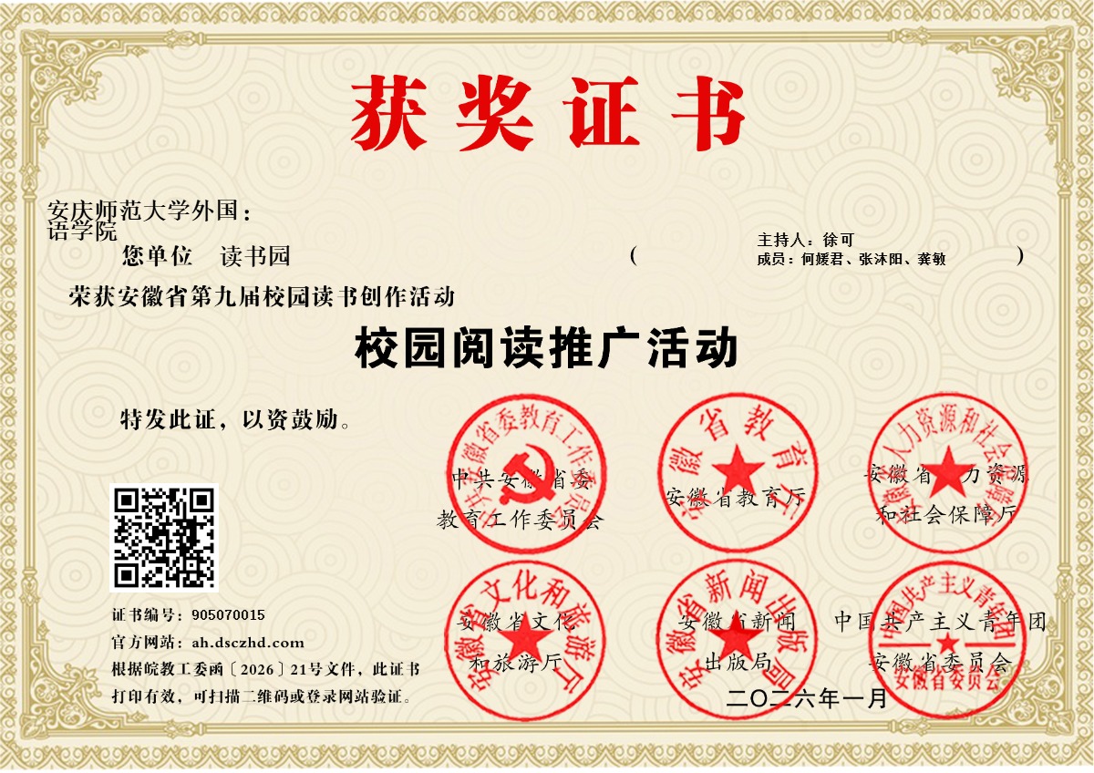 近日,安徽省第九届校园读书创作活动评选结果揭晓,外国语学院读书园凭借十七载深耕阅读推广的坚守与成效,获评“校园阅读推广活动”。